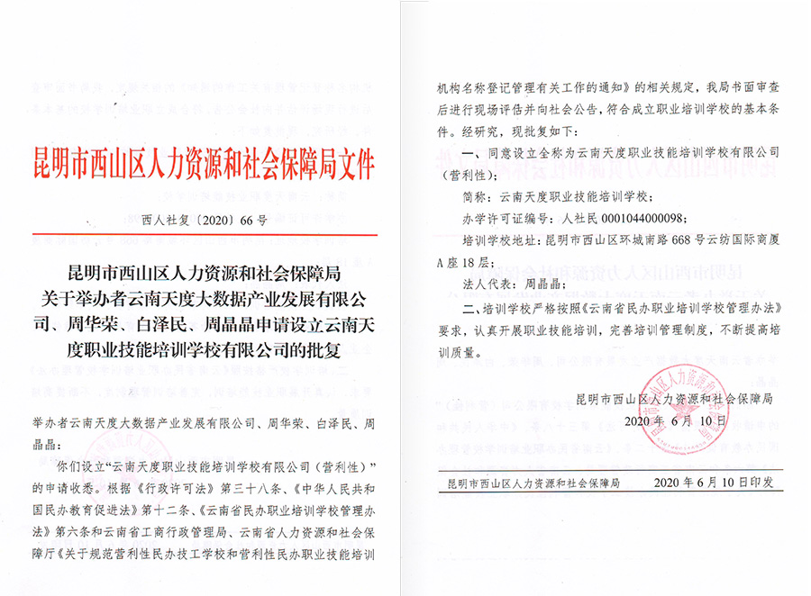 云南天度職業(yè)技能培訓(xùn)學(xué)校獲批成立,并取得《民辦學(xué)校辦學(xué)許可證》,免費電商培訓(xùn)、網(wǎng)絡(luò)直播培訓(xùn)、企業(yè)職業(yè)技能提升培訓(xùn)等業(yè)務(wù)板塊正式啟動